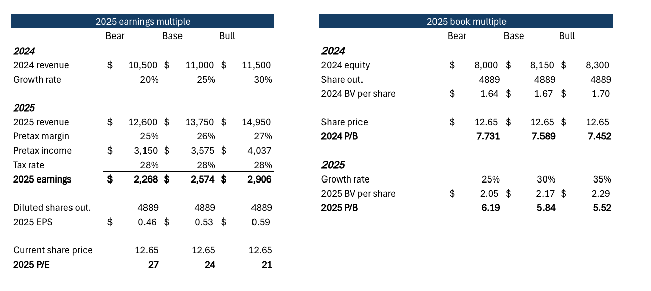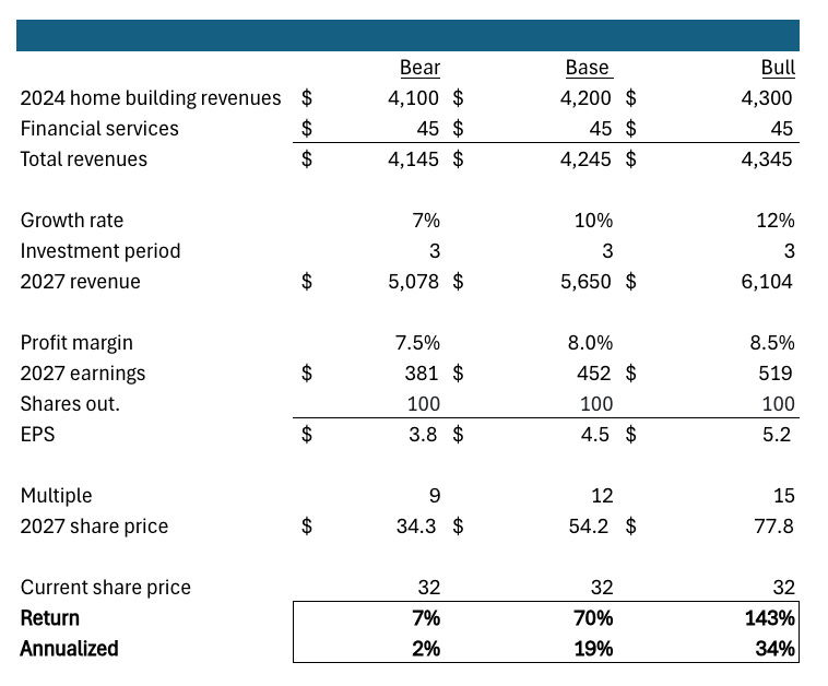 The valuation isn’t bad either and I’ve continued to add as the stock dips below $30. The following valuation doesn’t consider a huge recession, it factors in a some what slower housing market and similar growth to what DFH experienced in 2023 and multiples that are appropriate.