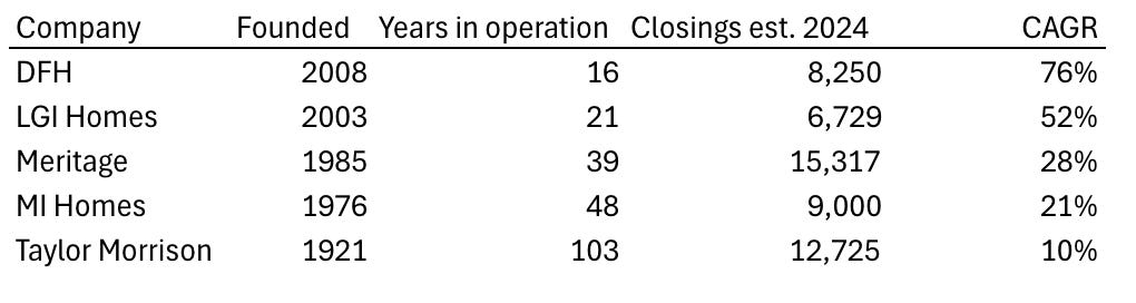 The company went on to grow dramatically over the next decade and is now expected to close 8,250 homes in 2024. This is impressive considering some competitors are closing a similar number of homes and yet were founded decades ago. Below is a comparison of a few competitors that have a similar sized home building operation as DFH. The CAGR figure represents how fast they’ve scaled over the period they’ve been in operation.