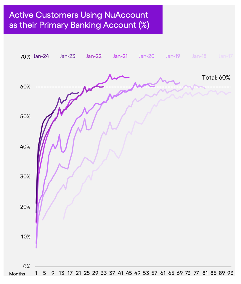 Another thing that I find interesting is that customers continue to increasingly use Nubank as their primary bank account at a faster pace. Below you can see that some of the early cohorts took 5+ years for 50% - 60% to be considered using Nubank as their primary account. You can also see that in more recent cohorts 60% were primary customers in less than 2 years. This is a good indication of the Nubank’s future as this implies people are trading out their traditional accounts for Nubank’s digital platform.