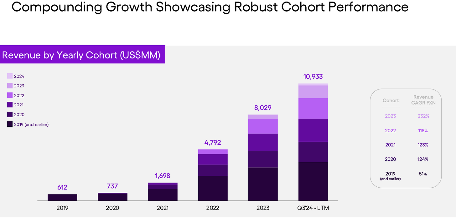 Between 2013 and 2024 they grew their customer count from 0 to 109.7 million , snatching up 56% of Brazils adult population and a growing number of customers in Mexico and Columbia, and a very high activity rate of 84%. Nubank continues to grow their customer and deposit base nicely (currently at $28 billion) and it appears that newer cohorts of customers have higher activity rates and use more Nubank products.