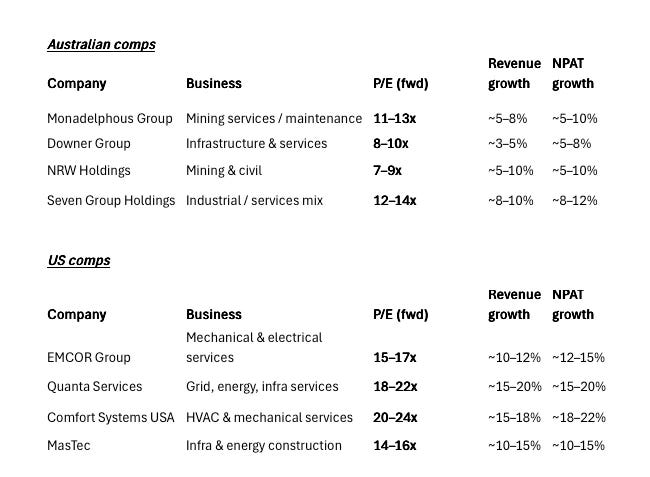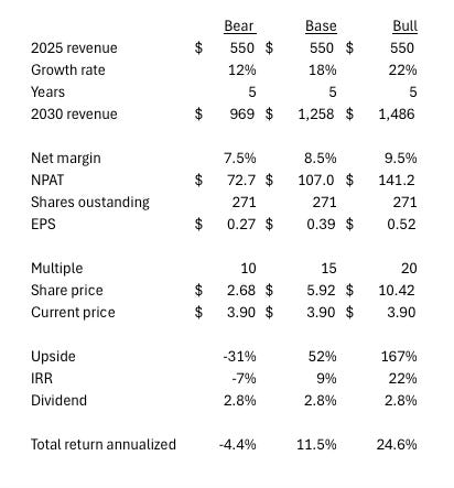 A multiple of 10-20x. Markets pay mid-teens to low-20s P/E for an industrial services company when growth is structural, and earnings compound reliably.2 The bull case could potentially be justified by continued operational execution and a slight re-rate. Base case is 15x.